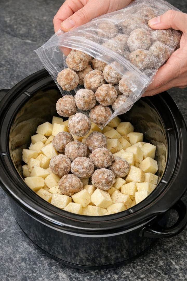 - Add the Meatballs: Pour the frozen meatballs directly over the potatoes. There is no need to thaw them first.