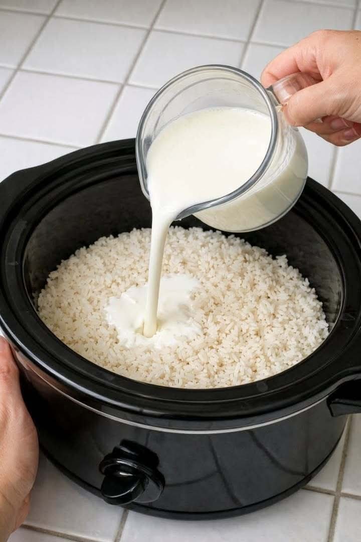 - Prep the Slow Cooker: Lightly grease the inside of your slow cooker with butter or non-stick cooking spray to prevent the rice from sticking to the edges.