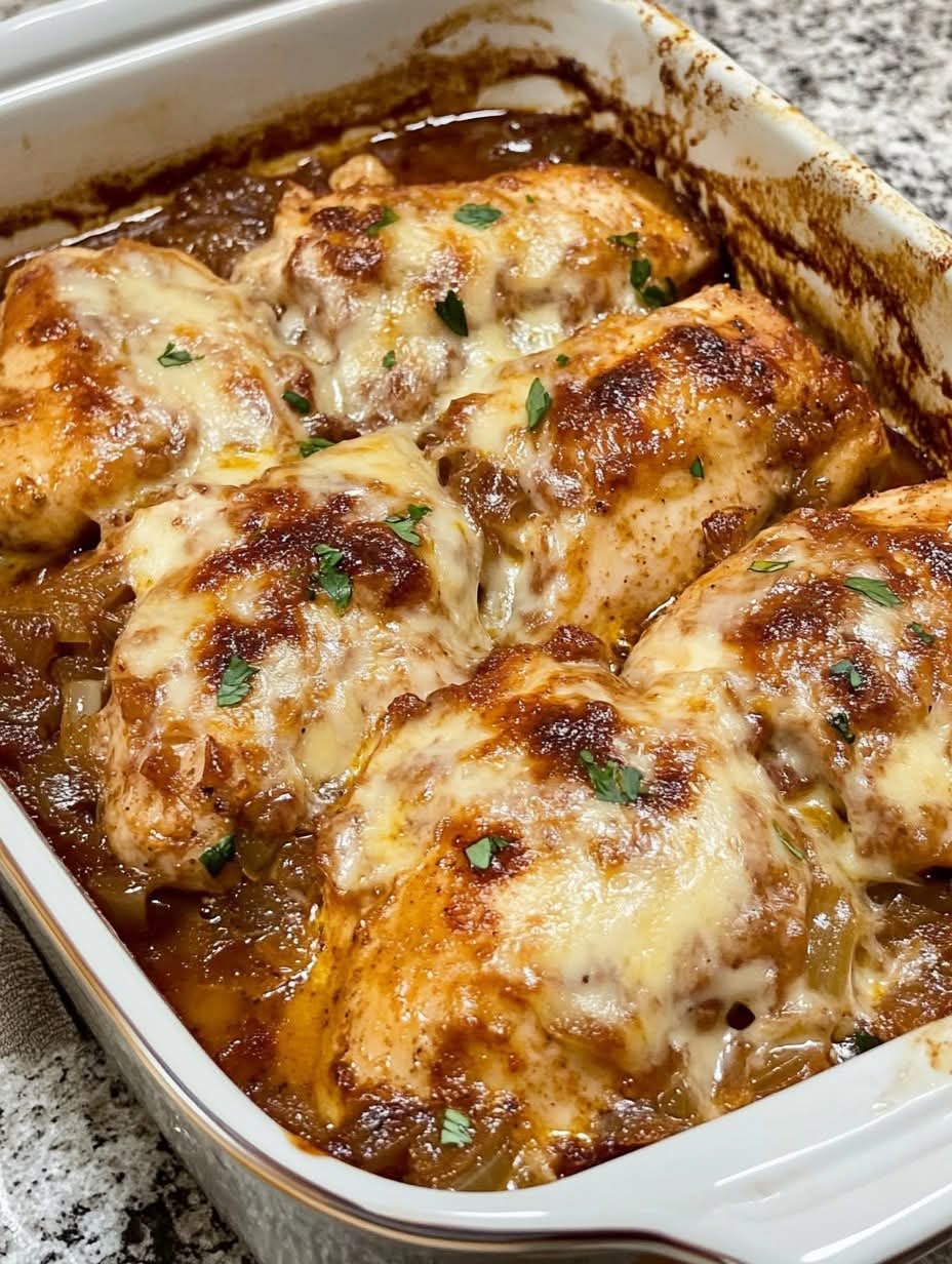 Juicy chicken breasts are smothered in sweet caramelized onions, melted Gruyère, and a rich, savory sauce that tastes just like French onion soup. This dish combines the elegance of French flavors with hearty American comfort — a perfect main course for cozy dinners, Sunday meals, or even special occasions.