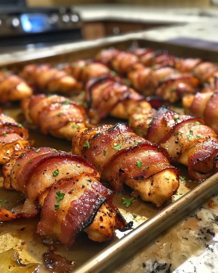Arrange the bacon-wrapped tenders on the prepared baking sheet. Bake for 20–25 minutes, or until the bacon is crispy and the chicken reaches an internal temperature of 165°F (74°C). For extra crispiness, broil for the last 1–2 minutes.