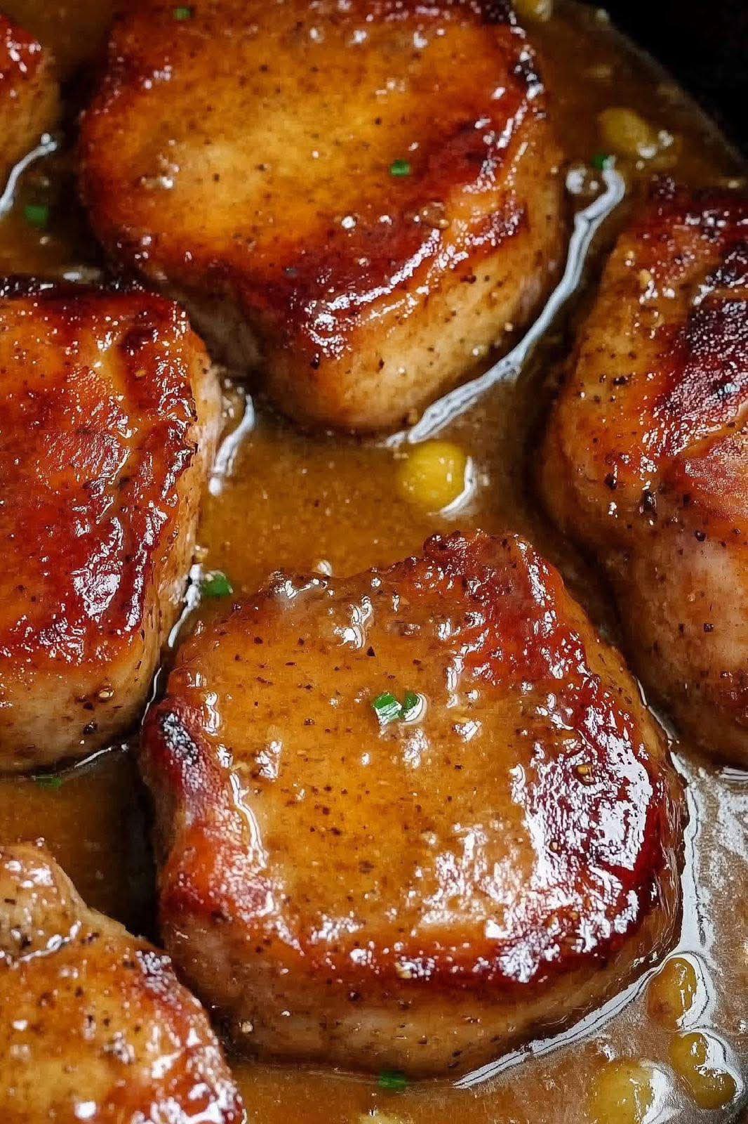Step 4: Combine and Simmer Return pork chops to the skillet, coating them in sauce. Simmer 5–7 minutes until fully cooked and tender (internal temperature 145°F / 63°C).